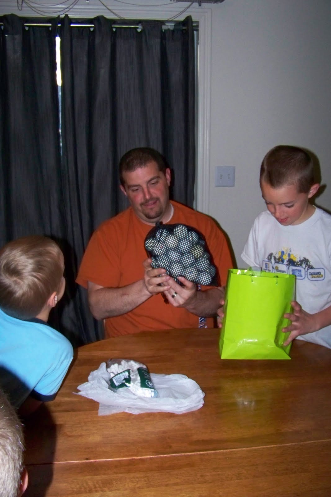 He got some balls and tees and finally some golf clubs from Sara! They weren't what he was hoping for, but the kids thought they were cool.